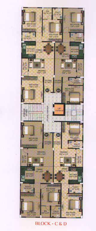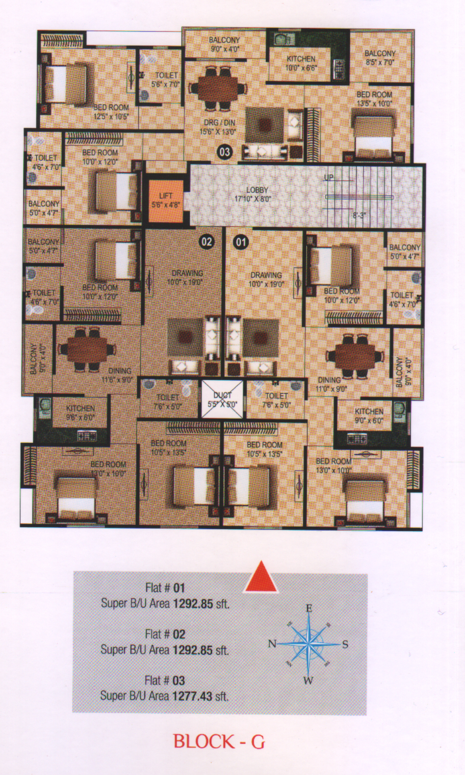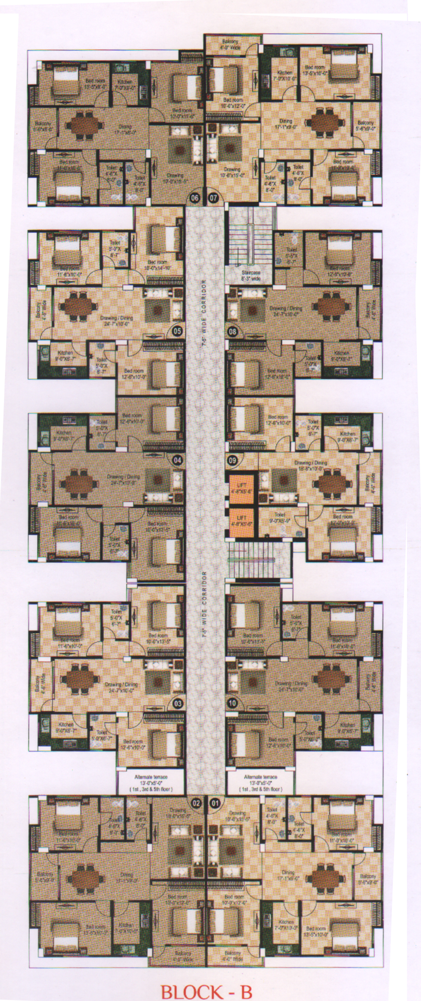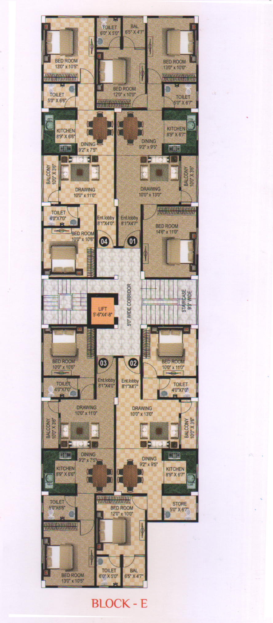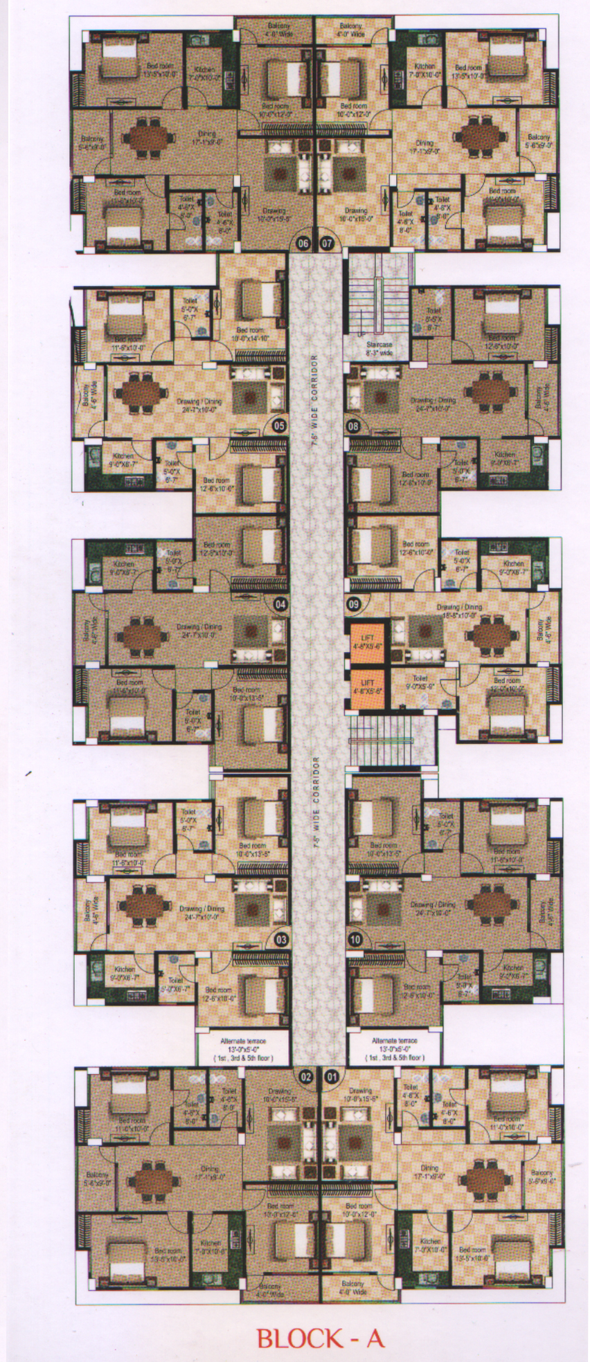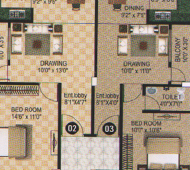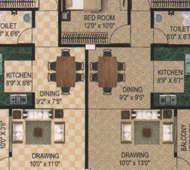 Marble/Vitrified Tiles in drawing / dining / bedroom and kitchen. Anti –skid ceramic tiles in toilet and balcony.