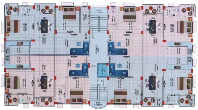 Marble/Vitrified Tiles in drawing / dining / bedroom and kitchen. Anti –skid ceramic tiles in toilet and balcony.